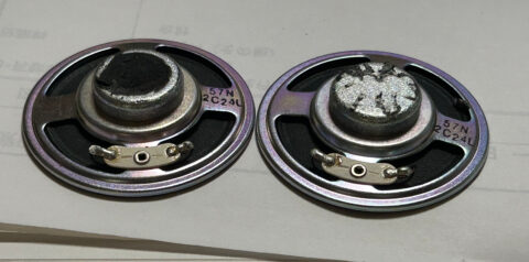 左の金色のスピーカーが今回購入した8Ω0.5Wで,右は元々付いていた “故障した” スピーカー