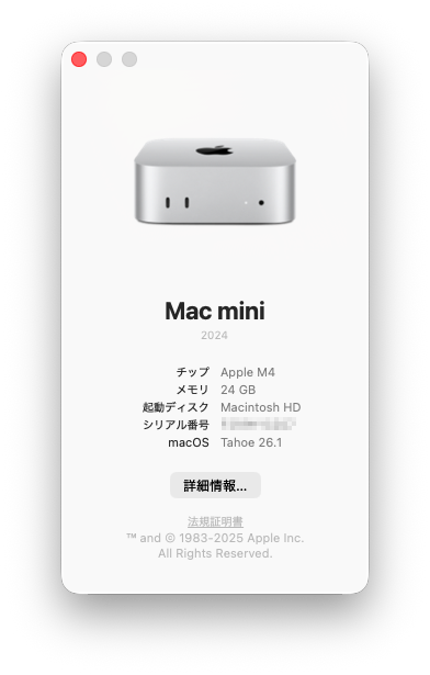 macOS 26.1 Tahoeが出ました.これまでサブWSである,Intel Mac miniがmacOS 26.xにupgradeできないので,諸々の互換性などを考えて,またメイジャーアップグレードの直後はかなり大きな不具合があるのが世の習いなので様子を見ていました.